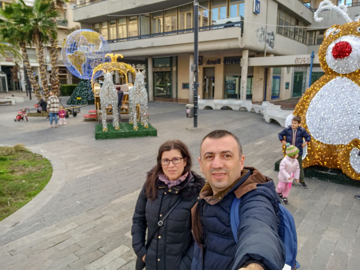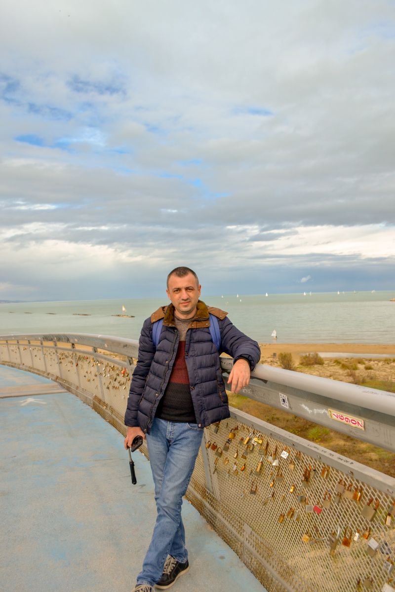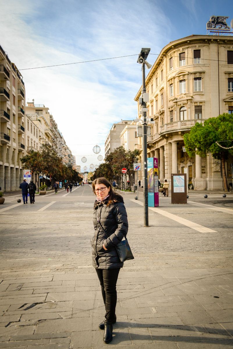 Așadar, luăm autobuzul ce strabate cei câțiva Km de-a lungul plajei dintre cele două localități și coborâm aproape de zona gării. Centrul Pescarei este mic. Facem câteva poze și ne îndreptăm spre mare. Aici ne atrage atenția un român ce cântă muzică populară alături de câinele lui cu ochelari și coroană pe cap 🙂